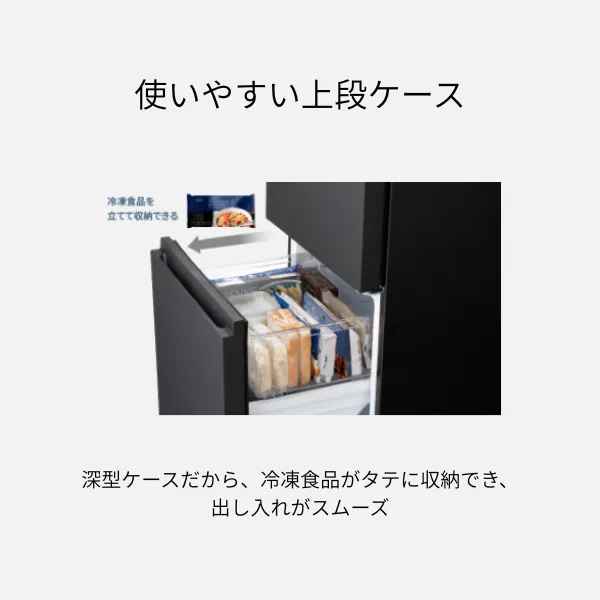 庫内の冷気をムラなく循環させるファン式を採用し、冷凍室は自動霜取りでメンテナンスの手間がありません。