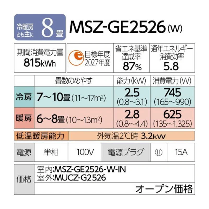 三菱 MITSUBISHI エアコン 2026年 霧ヶ峰 GEシリーズ おもに8畳用 ピュアホワイト MSZ-GE2526-W