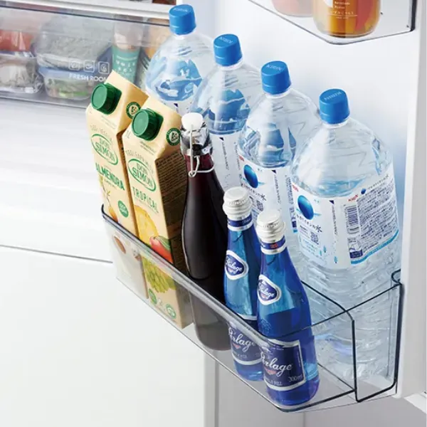 棚は高さ調整可能で、背の高い容器も収納しやすく、ドアポケットは飲料や調味料を整理しやすいため、限られた庫内スペースを効率よく使えます。