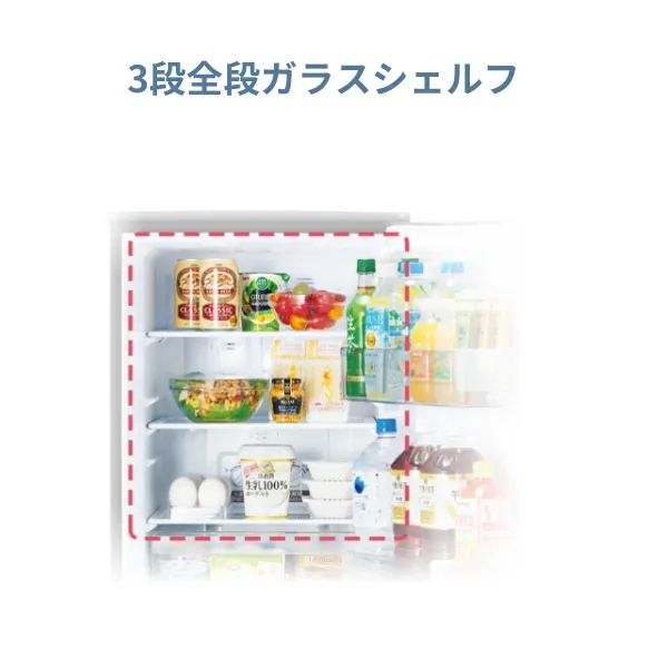 冷蔵室は日常使いの食材や飲料の収納に適した広さ、冷凍室は冷凍食品やアイス、余った食材の保存に対応可能。大容量ではない分、無駄なスペースが少なく省スペース性に優れています。