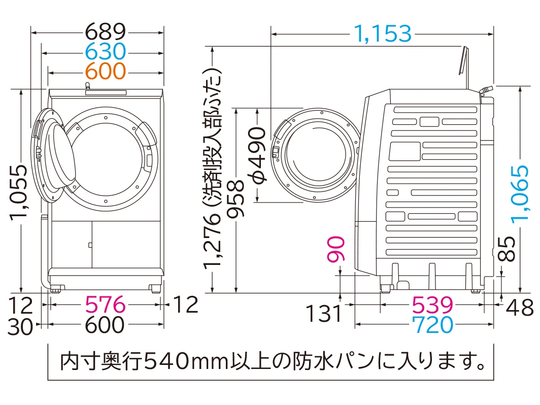 - 幅(本体幅)×高さ×奥行:630(600)×1065×720(外形寸法は給水ホース取付部・排水ホースを含みます。本体幅の寸法は手掛けを含みません。) mm