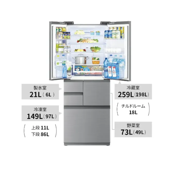 - タイプ:6ドア冷凍冷蔵庫(観音開き/ピラーレスフレンチドア)