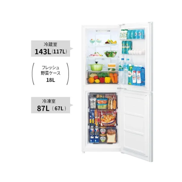 冷蔵室・冷凍室の最低限の構成を持ち、食材の量があまり多くない単身者や二人暮らしにちょうど良い容量です。
