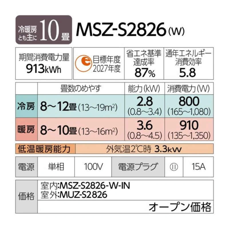 三菱 MITSUBISHI エアコン 2026年 霧ヶ峰 Sシリーズ おもに10畳用 ピュアホワイト MSZ-S2826-W